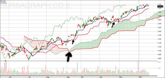 בדוגמא המצורפת כאשר ניתן לראות מגמת עלייה ברורה שהחלה בספטמבר 2010, מסומנת בחץ השחור הגדול (התחתון מבין החצים).