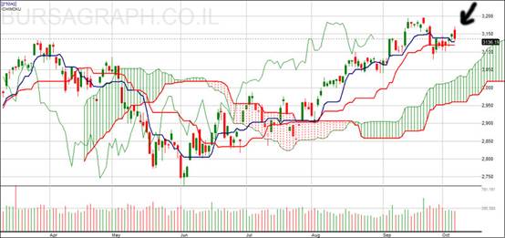 ניתוח של מדד הנאסד"ק נכון לסוף השבוע הראשון של אוקטובר 2012 על פי ענן האיצ'ימוקו בגרף יומי מעלה מספר מסקנות: קודם כל ברור שהענן ירוק והמחירים מעליו כלומר - הנאסד"ק במגמת עלייה. שימו לב לקו הכחול (Conversion Line) אשר הפך כיוון והחל עושה את דרכו מטה. אם במהלך השבוע הקרוב יתרחש CROSS כלומר חצייה של הקו כחול את האדום, יהווה הדבר איתות מכירה וסגירת פוזיציית LONG בנאסד"ק. בנוסףף, רמות התמיכה החשובות הקרובות הינן באזור 3,100. זהו למעשה אזור התמיכה הנגזר מהחלק העליון של ענן האיצ'ימוקו על הגרף המצורף.